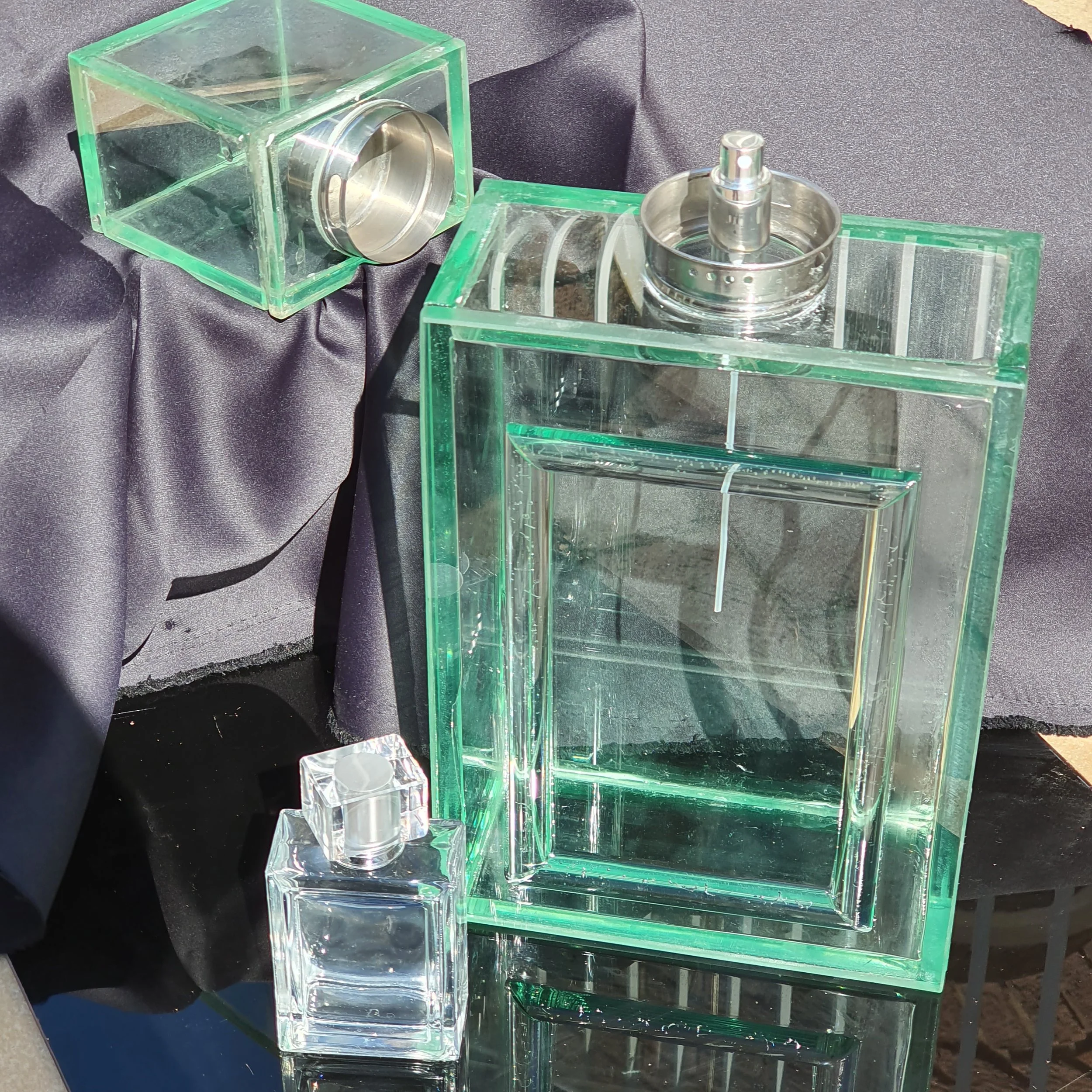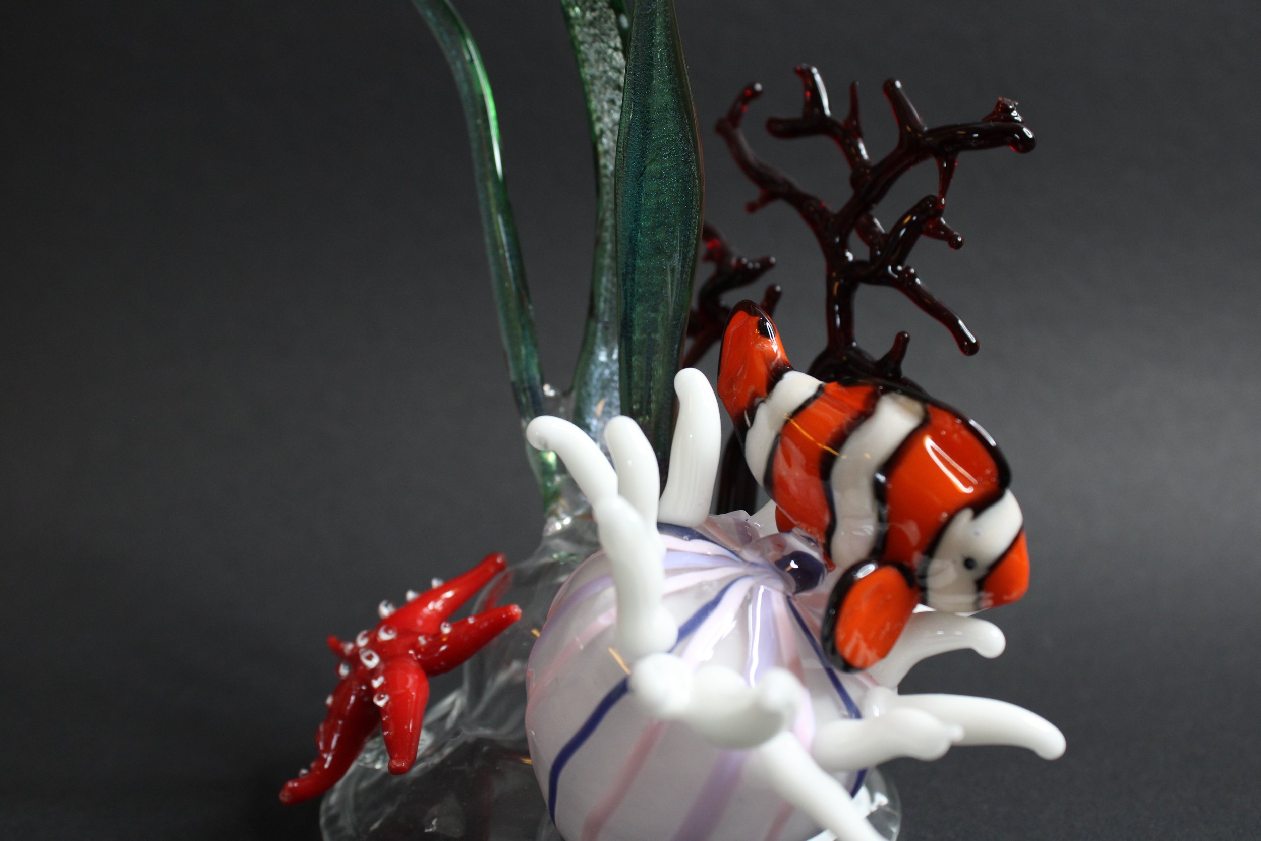 Forskellige farverige glasvaser og glasfigurer lavet af ætset glas på sort baggrund.