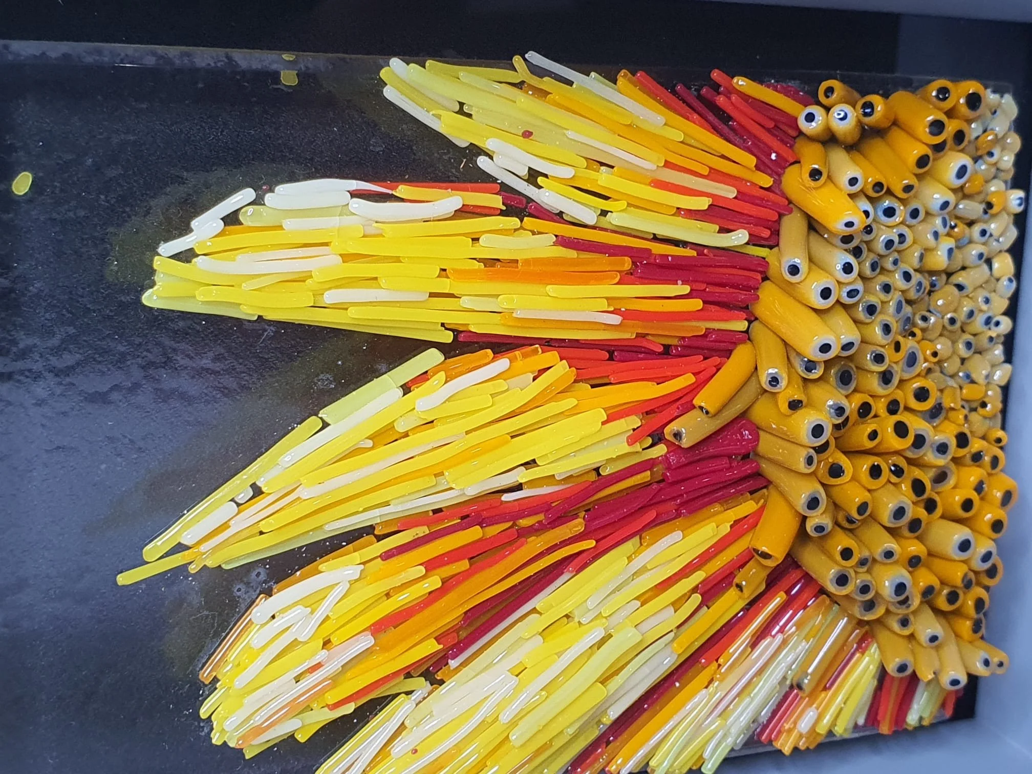 Et kunstværk kaldet "Next Generation Glass" af Mike Rabkin, bestående af en 50x50 cm glasplade med en kompleks struktur af klare og sorte plastikanordninger, der ligner en abstrakt tre-dimensionel form.