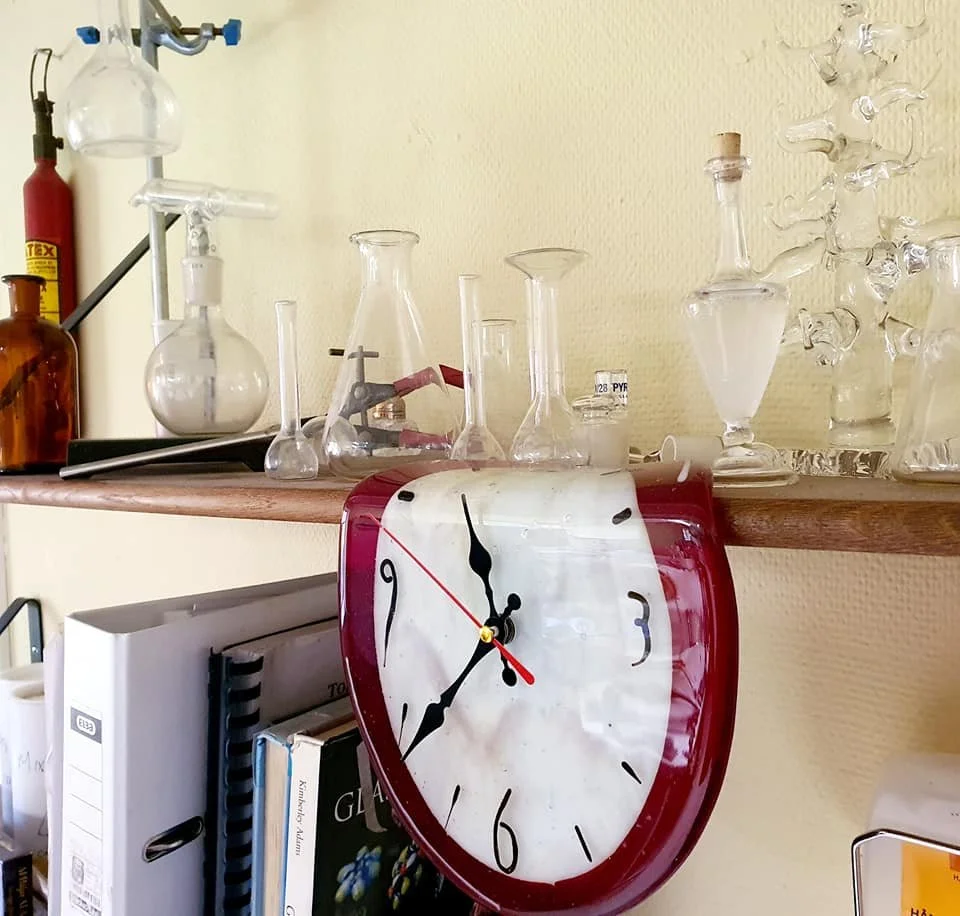 Mand holder et stort glaskunstværk med flere lag, i en værkstedsindstilling.